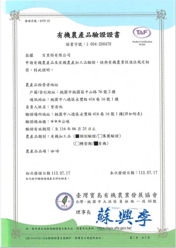 百里特的瓜地馬拉有機咖啡豆經德國KIWA BCS與台灣寶島有機驗證機構驗證,從咖啡農地到生豆處理廠,每一個環節都嚴格遵循標準,並獲得美國USDA,歐盟,及日本有機認證。生豆進口後獲得台灣農糧署核發的有機認證字號,並經台灣寶島有機驗證機構驗證的食品級烘焙工廠烘焙製造,致力提供咖啡愛好者最好的選擇,天然,有機,健康就是我們的堅持。