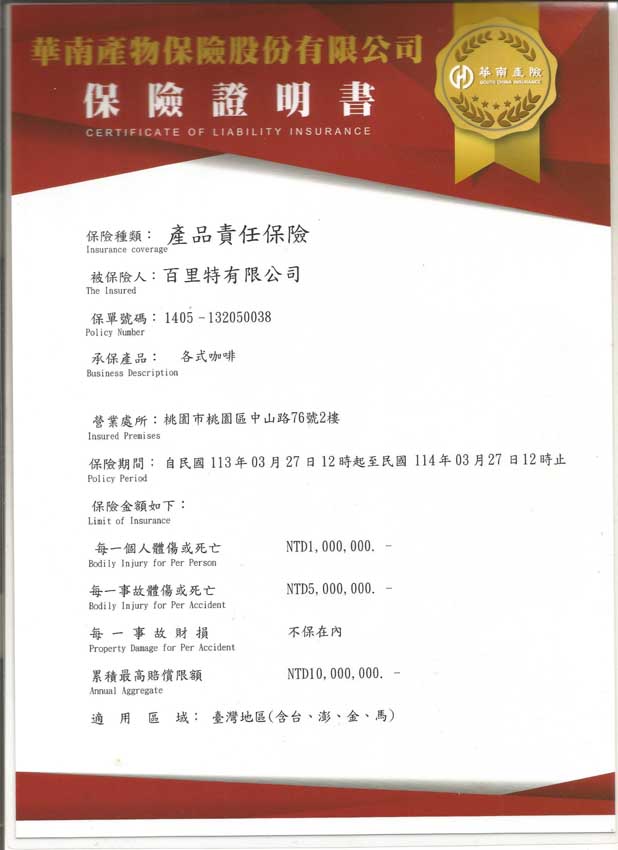 產品責任險單號:1405字第102050028號