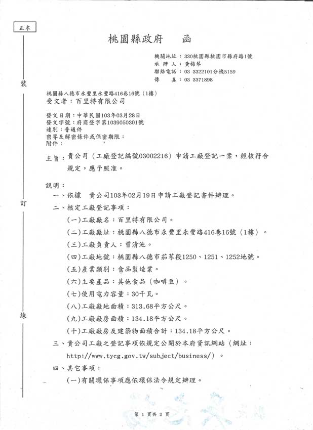 百里特咖啡核准設立於2010年,為桃園在地擁有合法咖認證的專業烘豆與包裝工廠。